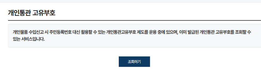 - 메인 페이지에서 '개인통관고유부호 조회' 버튼을 클릭합니다.