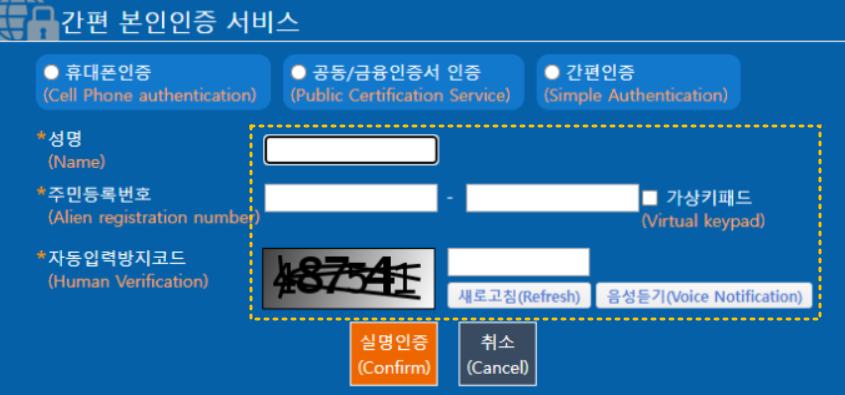 - 본인 확인창에서 다음 정보를 입력합니다.