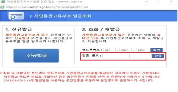 - 조회: 개인통관고유부호 조회/재발급 메뉴 클릭