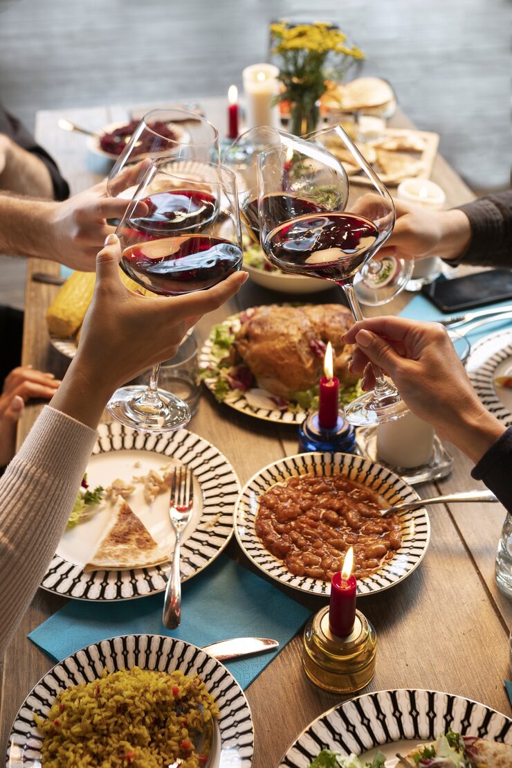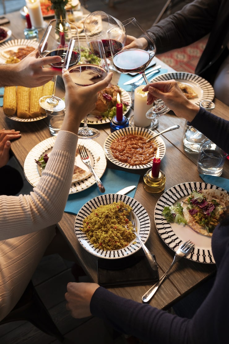 건배할 때는 술잔을 눈높이 정도로 들어 올립니다. 너무 높거나 낮으면 어색해 보일 수 있어요.