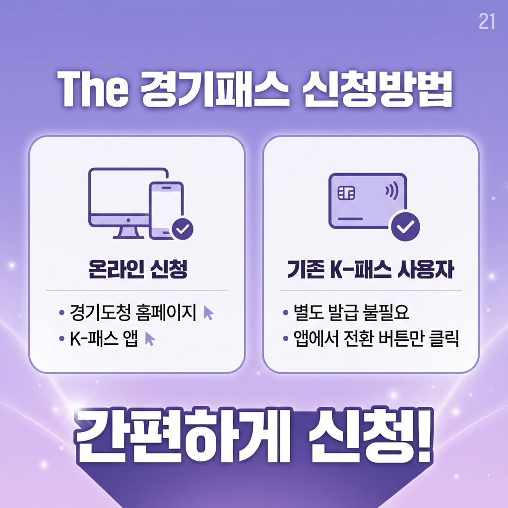 신청 방법: 경기도청 홈페이지 또는 K-패스 앱에서 온라인 신청 가능하며, 기존 K-패스 사용자는 별도 카드 발급 없이 앱에서 [The 경기패스 전환] 버튼만 누르면 됩니다.
