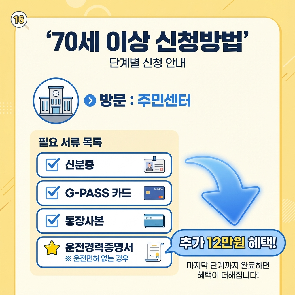 거주 지역 읍·면·동 주민센터를 방문하여 신청하시면 됩니다. 신분증과 G-PASS 카드, 통장사본을 지참하시고, 운전면허가 없으신 분은 운전경력증명서를 함께 제출하시면 추가 인센티브를 받으실 수 있습니다.