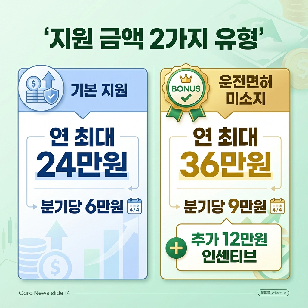 - 운전면허 미소지 시: 연 최대 36만원 (분기당 9만원) - 추가 인센티브 12만원