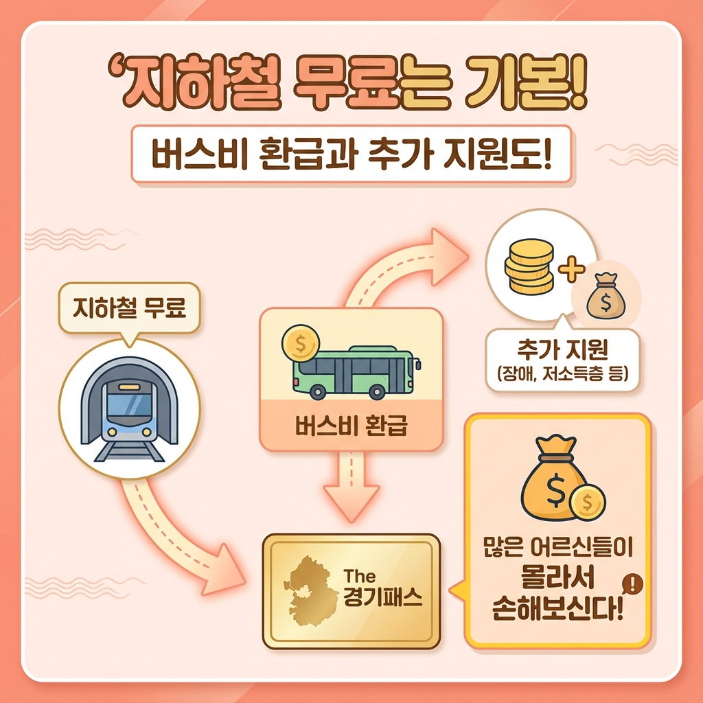 많은 어르신들이 지하철은 무료로 탈 수 있다는 건 아시지만, 버스비 환급이나 추가 교통비 지원은 잘 모르시는 경우가 많습니다. 이 글을 끝까지 읽으시면 경기도 노인 교통비 지원의 모든 혜택을 빠짐없이 받으실 수 있습니다.