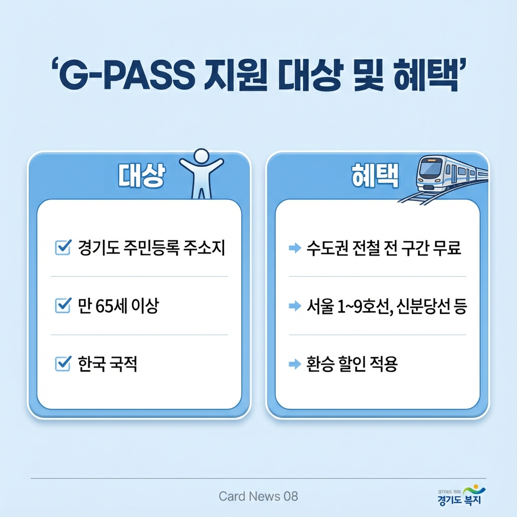 - G-PASS (지패스): 만 65세 이상 전체 - 수도권 전철·지하철 무료 이용