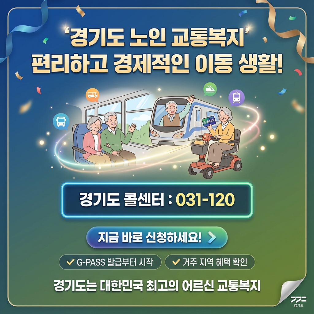 2026년 경기도 노인 교통비 지원 제도를 최대한 활용하시어 편리하고 경제적인 이동 생활을 누리시기 바랍니다. 경기도는 대한민국에서 가장 적극적으로 어르신 교통복지를 실현하고 있는 지역입니다. G-PASS 발급부터 The 경기패스 신청까지, 가까운 농협이나 주민센터를 방문하시면 친절하게 안내받으실 수 있습니다. 궁금한 사항은 경기도 콜센터(031-120) 또는 거주 지역 시·군청 교통정책과로 문의하시면 상세한 안내를 받으실 수 있습니다.