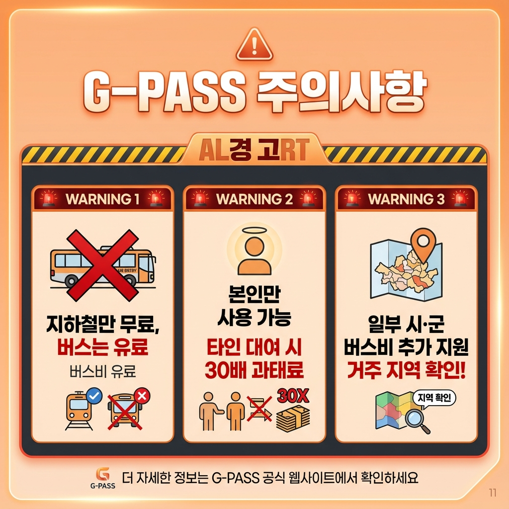 주의사항: G-PASS는 지하철만 무료이며, 버스는 유료입니다. 단, 경기도 내 일부 시·군에서는 버스비도 추가 지원하므로 거주 지역의 별도 사업을 확인하시기 바랍니다. 또한 본인만 사용 가능하며, 타인에게 대여 시 무임승차로 간주되어 30배 과태료가 부과될 수 있습니다.