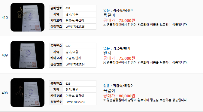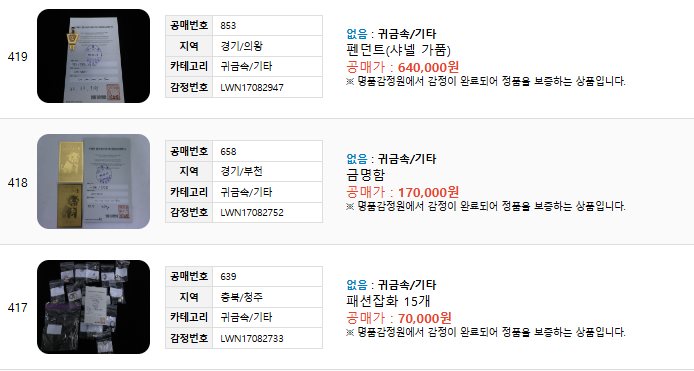 총 419점의 귀금속으로, 감정가 이상의 입찰가를 제안한 최고 입찰자에게 낙찰됩니다.