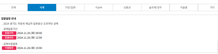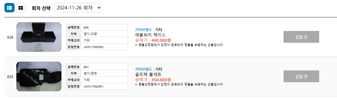 경기도 압류물품 공매 사이트에서는 공매 대상 물품 목록을 사전 조회할 수 있는 기능을 제공합니다. 2024년 11월 11일부터 11월 26일까지 경기도 누리집 또는 한국경공사 홈페이지를 통해 사전 물품 조회가 가능하며, 경기도의 고액 체납자들이 압류당한 다양한 명품 물품의 목록과 최저 입찰가를 확인할 수 있습니다.