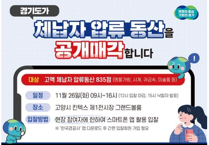 경기도 지방세 고액 체납자 압류물품 매각 행사는 오는 11월 26일, 경기도 일산 킨텍스에서 오전 9시부터 12시까지 진행됩니다. 이 시간 동안 경기도는 다양한 물품을 공개 매각하며, 입찰 참여자 중 최고가 제안자에게 낙찰됩니다.