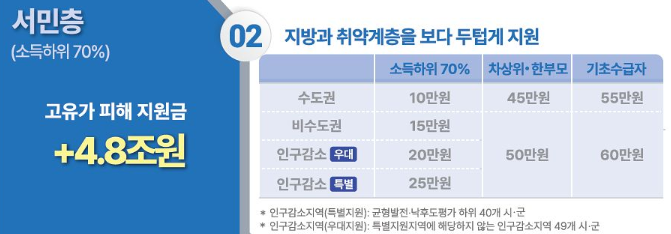 물가 상승의 타격이 더 큰 비수도권의 고유가 지원금 지급대상 혜택은 더욱 두텁습니다. 비수도권 일반 가구는 15만 원(인구감소지역 최대 25만 원), 차상위계층은 50만 원, 기초수급자는 최고액인 60만 원의 고유가 지원금 혜택을 다가오는 지급시기에 누릴 수 있습니다.