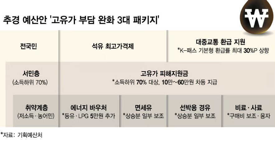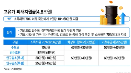- 고유가 지원금 지급대상: 소득 하위 70% 이하 가구 (건보료 기준)