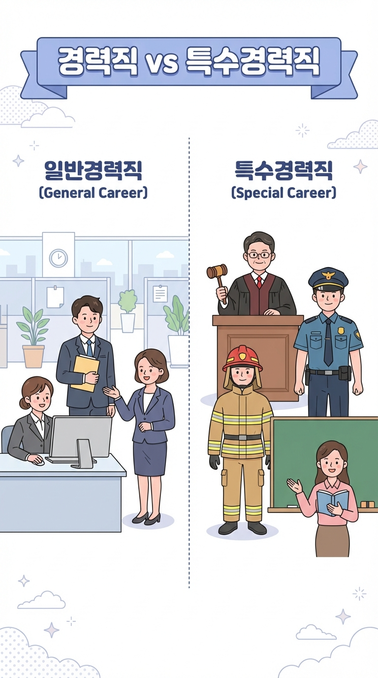 공무원은 크게 경력직 공무원(일반직, 특정직)과 특수경력직 공무원(정무직, 별정직)으로 나뉩니다. 일반직 공무원은 기술·연구 또는 행정 일반 업무를 담당하며, 특정직 공무원은 법관, 검사, 경찰, 소방, 교육공무원, 군인 등 특수 분야를 담당합니다.
