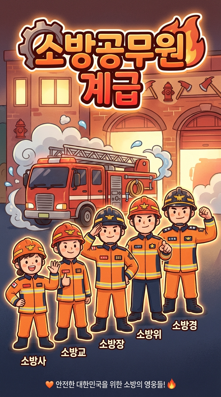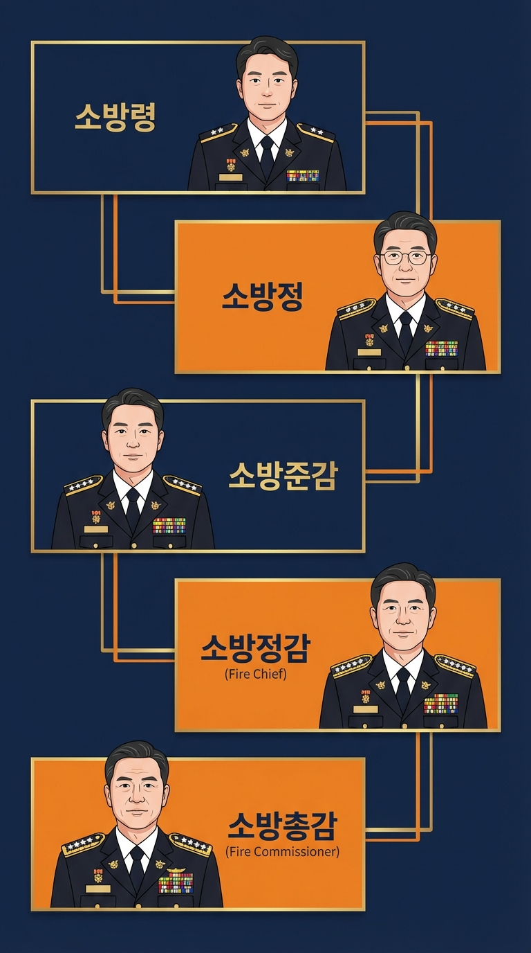 - 소방공무원: 소방사(9급) → 소방교(8급) → 소방장(7급) → 소방위(6급) → 소방경(5급) → 소방령(4급) → 소방정(3급) → 소방령(2급) → 소방총감(1급)