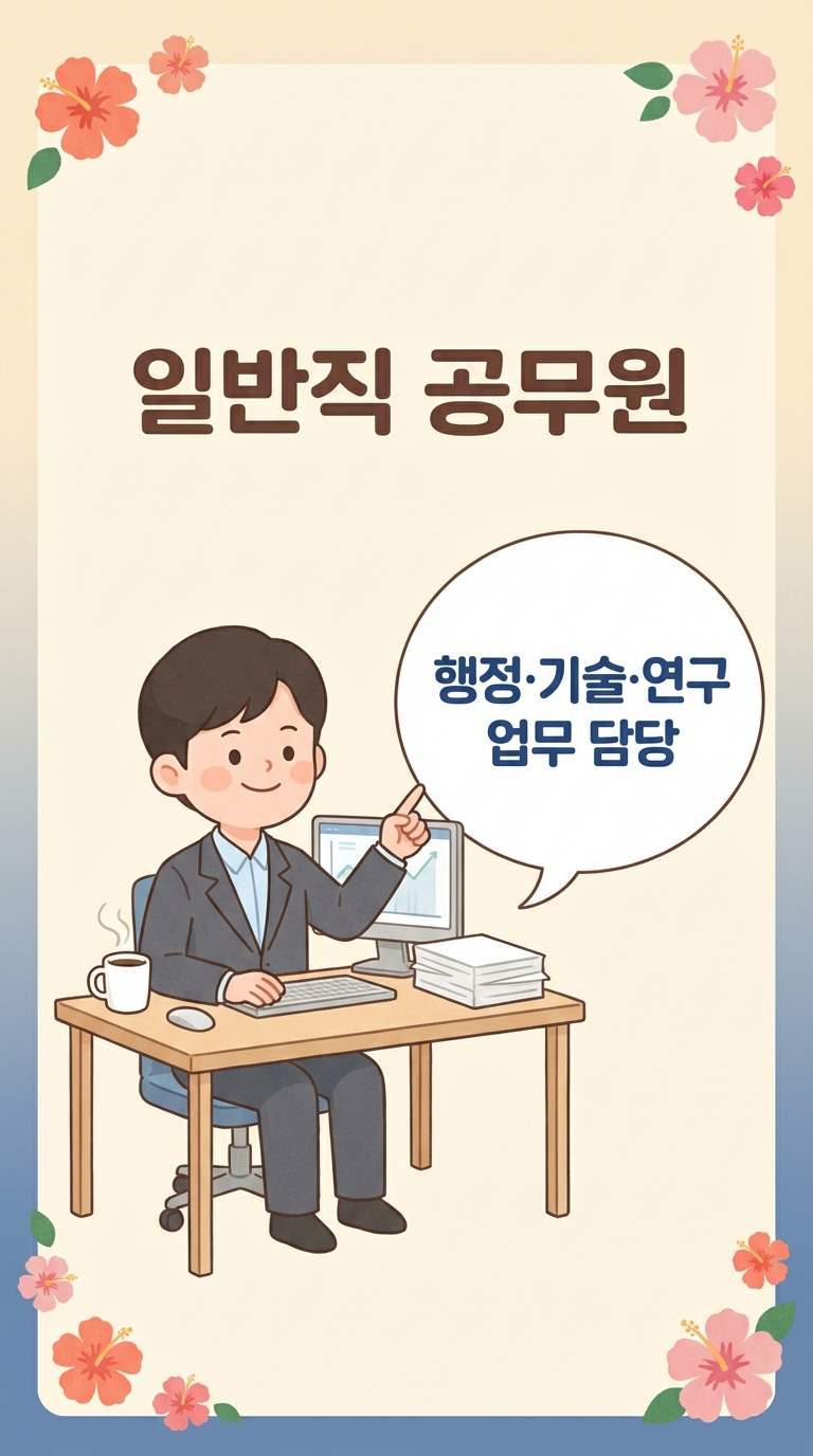 공무원은 크게 경력직 공무원(일반직, 특정직)과 특수경력직 공무원(정무직, 별정직)으로 나뉩니다. 일반직 공무원은 기술·연구 또는 행정 일반 업무를 담당하며, 특정직 공무원은 법관, 검사, 경찰, 소방, 교육공무원, 군인 등 특수 분야를 담당합니다.