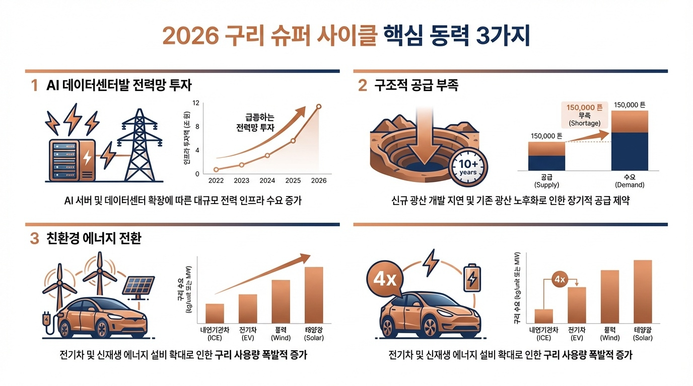 경기 선행 지표로 불리던 구리가 이제는 4차 산업혁명의 필수재로 변모했습니다. 2026년 구리 슈퍼 사이클을 이끄는 핵심 동력은 딱 세 가지입니다.