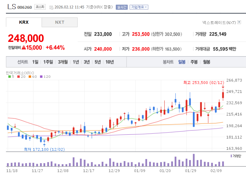 LS는 현재 증권가에서 가장 뜨거운 종목입니다. 2월 12일 기준 대신증권과 CLSA가 목표주가를 30만 원 부근까지 상향했습니다. 자회사의 성장과 주주환원 정책이 맞물려 구리 관련 대장주 중 가장 안정적인 우상향 흐름을 보이고 있습니다.