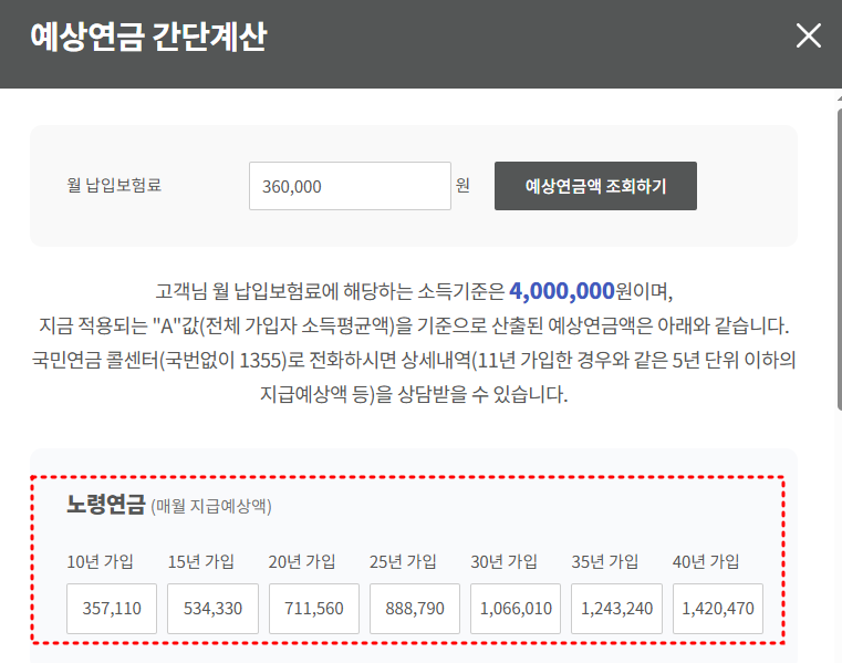예를 들어, 월급 400만원을 기준일때 국민연금 수령액은 다음과 같습니다.