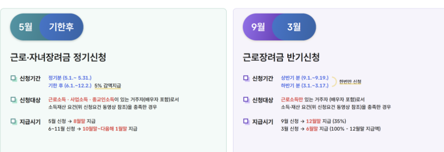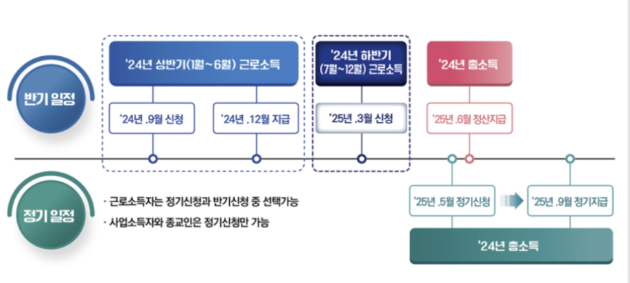 반기신청은 근로소득자만 이용할 수 있는 방법으로, 상반기분은 9월 1일부터 9월 19일까지 신청하여 12월 말에 지급받고, 하반기분은 다음해 3월 1일부터 3월 17일까지 신청하여 6월 말에 지급받습니다.