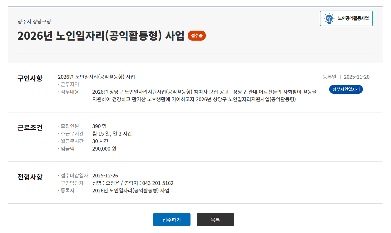 2026년 노인일자리 신청자격은 만 60세부터 만 65세 이상까지 유형별로 다르게 적용됩니다. 올해는 총 115만개의 일자리가 모집되며, 공익활동형 월 29만원부터 역량활용형 월 76만원까지 활동비가 지급됩니다. 신청 기간은 2025년 11월 28일부터 12월 26일까지로 짧은 편이므로 조건 확인이 중요합니다.
