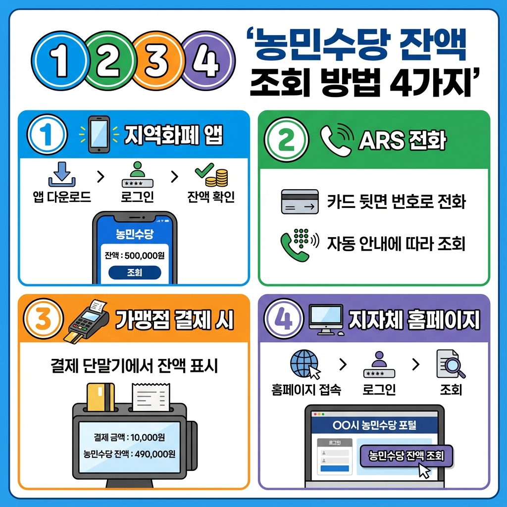 - ④ 지자체 홈페이지: 시·군·구청 홈페이지 → 농민수당 잔액 조회 메뉴