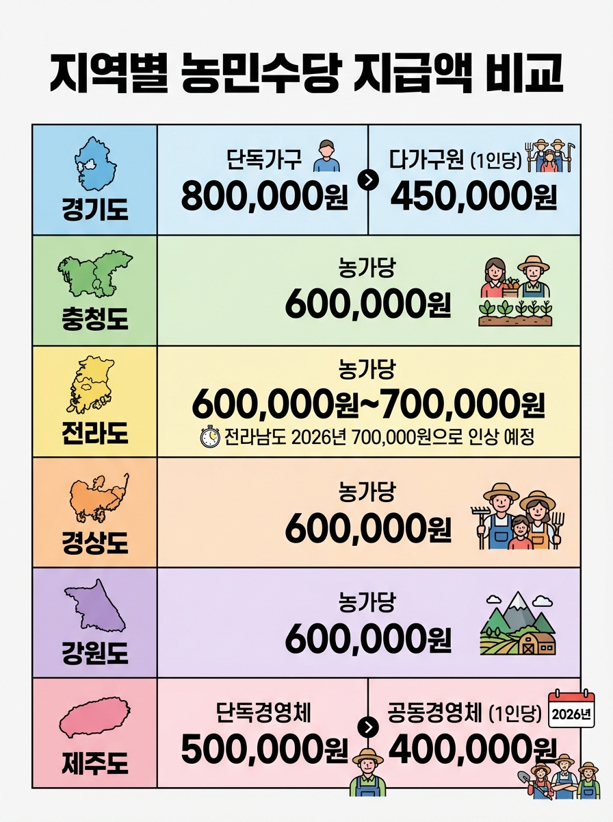 • 전라도: 농가당 연 60~70만원 (전남 2026년부터 70만원)
