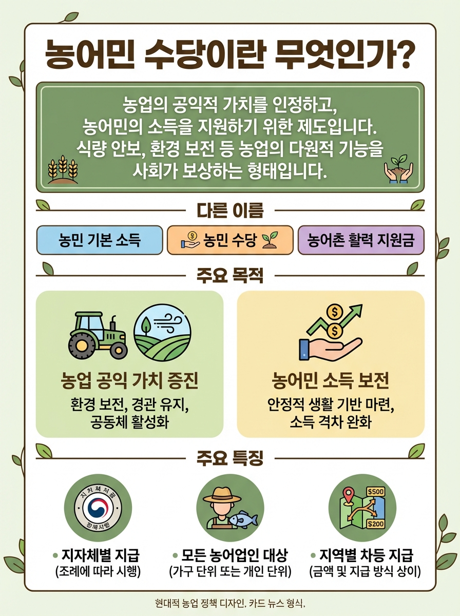 농민수당(농민공익수당, 농민기본소득)은 농업의 공익적 가치를 인정하고 농업인의 소득을 보전하기 위해 지방자치단체에서 지급하는 수당입니다. 농업인이라면 누구나 신청할 수 있으며, 지역마다 지급 금액과 조건이 조금씩 다릅니다.