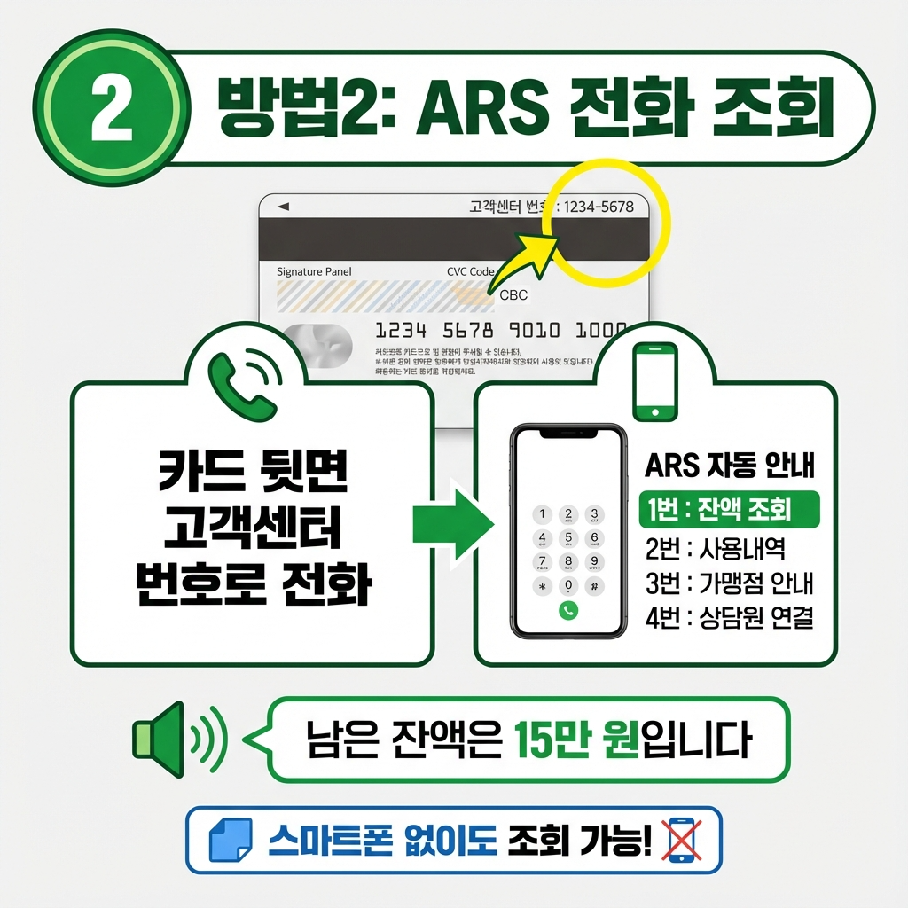- ② ARS 전화: 카드 뒷면에 있는 고객센터 번호로 전화 → 자동 안내에 따라 잔액 조회