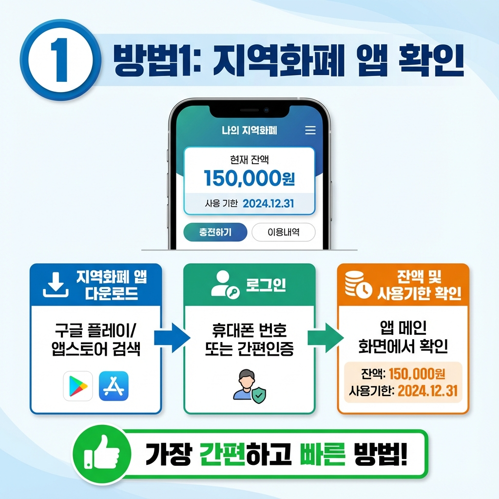 • ① 지역화폐 앱 확인: 각 지역 지역화폐 앱 다운로드 → 로그인 → 잔액 및 사용기한 확인