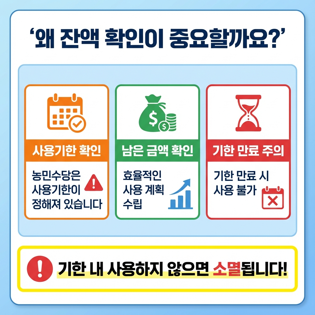 가장 중요한 것이 바로 농민수당 사용기간입니다. 지급받은 수당을 기한 내에 사용하지 않으면 잔액이 자동으로 소멸되어 환불받을 수 없습니다. 농민수당 사용기간은 지역마다 차이가 있으니 반드시 확인해야 합니다.
