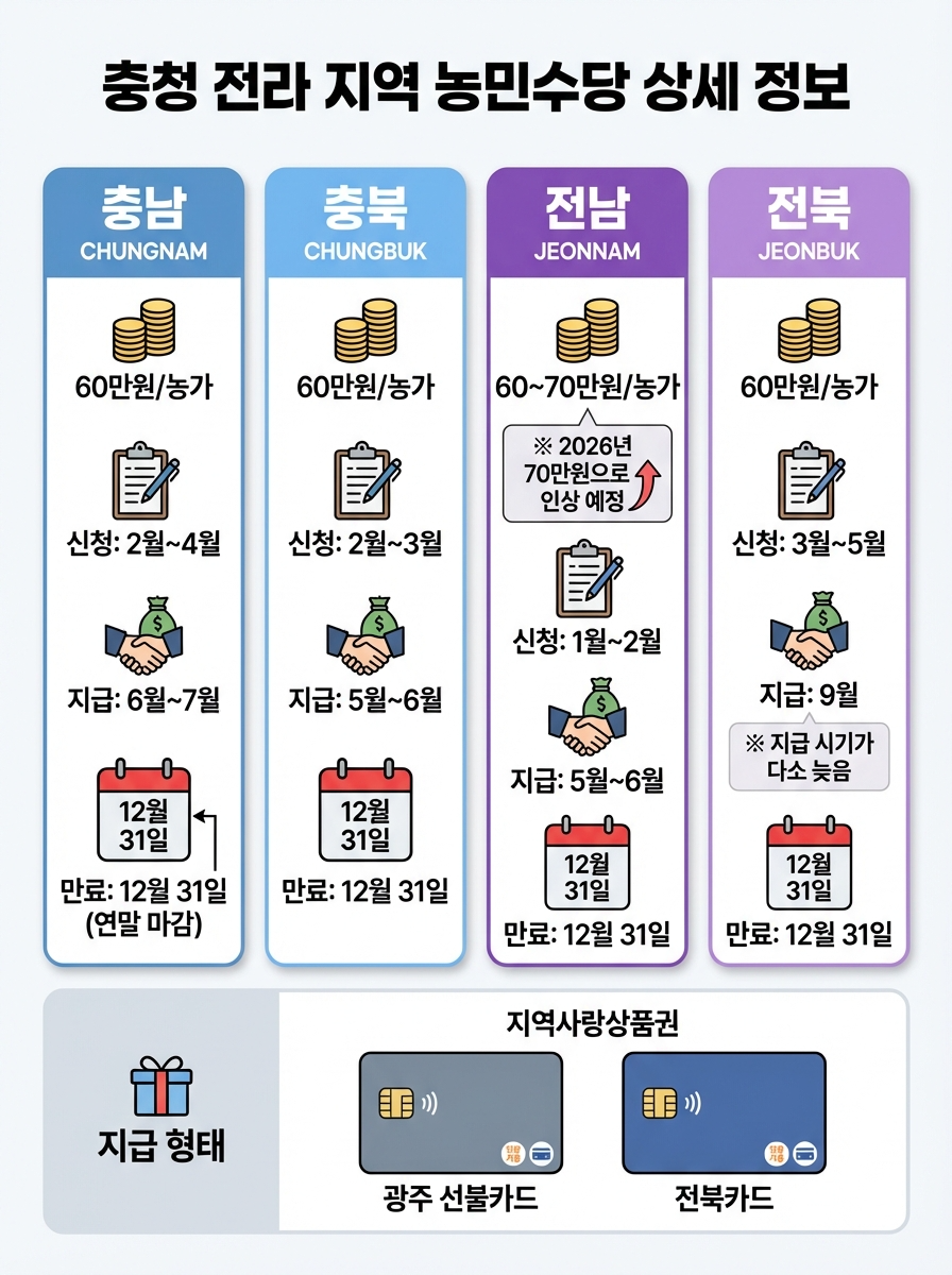 - 전라도: 농가당 연 60~70만원 (전남 2026년부터 70만원)