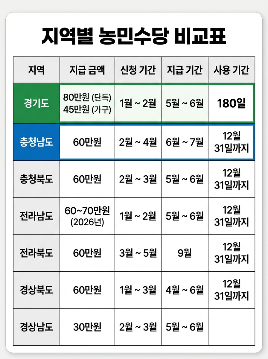 충청도, 전라도, 경상도, 제주도 등 대부분의 지역에서 적용됩니다. 농민수당 사용기간은 지급받은 해의 12월 31일까지입니다.