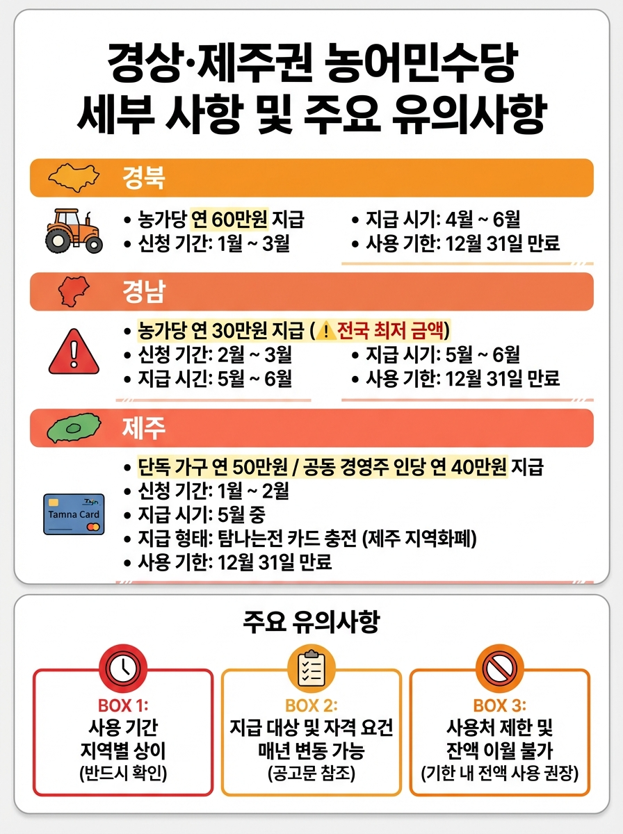 - 제주도: 1인 경영체 50만원, 2인 이상 공동경영체 1인당 40만원 (2026년 기준)
