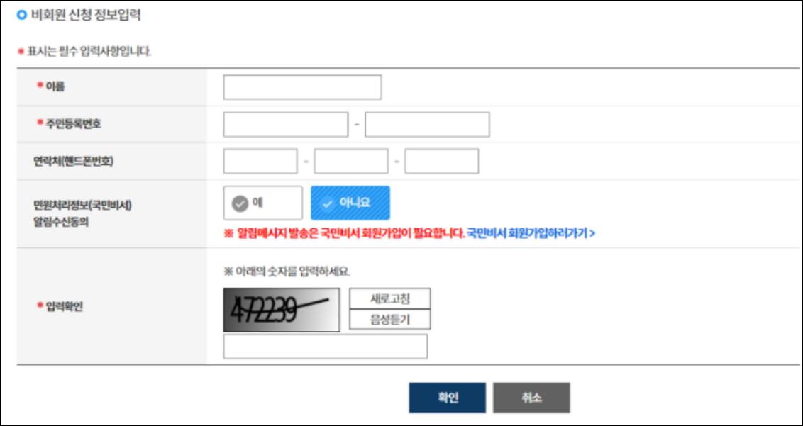 2. 비회원신청이라면, 개인정보 동의와 개인 인적사항을 입력해 주세요.