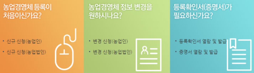 정부에서는 농업경영의 효율성과 경쟁력을 높이기 위하여 다양한 지원정책을 시행하고 있는데요, 이러한 정책혜택을 받기 위해서는 농업인임을 입증할 수 있는 농업경영체등록이 완료되어 있는지 꼭 확인해야 합니다.