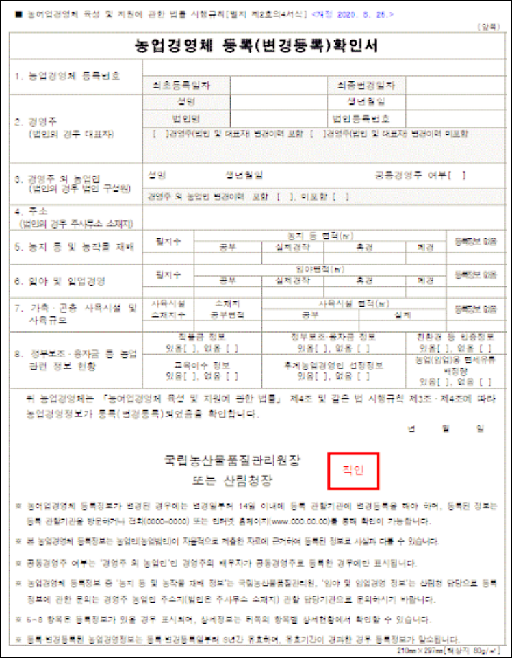 농업경영체등록 확인서에는 농업경여체 등록번호와 함께 최초등록일자와 최종변경일자, 경영주의 정보로 이름과 생년월일, 농업법인이라면 법인명과 법인번호 등이 표시됩니다.