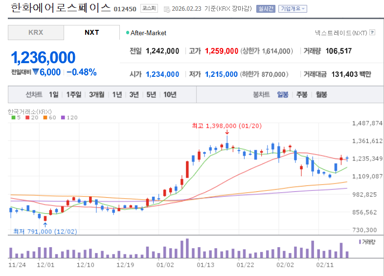 - 주가 전망: 2026년 2월 기준 증권가 목표가는 13만 7,000원까지 상향되었습니다. 방산뿐만 아니라 우주 위성 사업까지 궤도에 오르며 실적 퀀텀 점프가 예상됩니다.