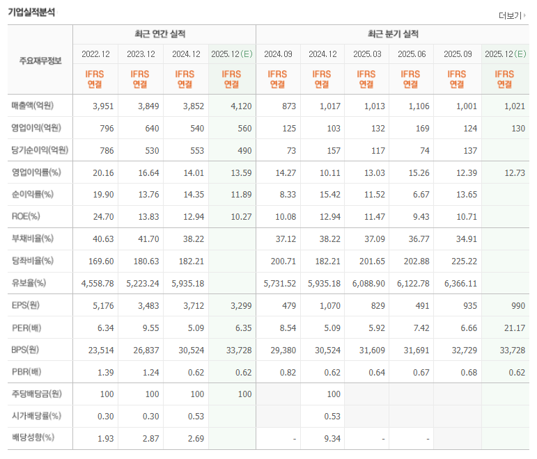 | 유보율 | 5,935% | - | 현금 부자 (이익잉여금 4,700억) |
