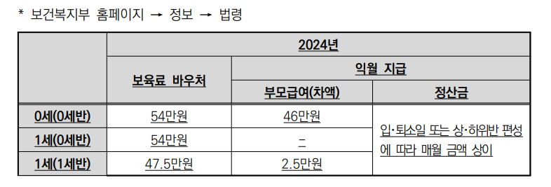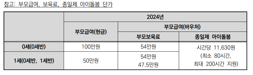 2024년부터는 부모급여 지급대상에게 만 0세 아동에게 월 100만 원, 만 1세 아동에게 월 50만 원이 지급되며, 이는 현금 또는 어린이집 보육료 바우처로 제공됩니다.