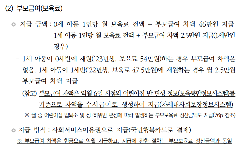 예를 들어, 만 0세 아동의 경우 부모급여는 총 100만 원이 지급되며, 이 중 54만 원이 보육료로 지원되고, 나머지 46만 원이 부모에게 현금으로 지급됩니다.