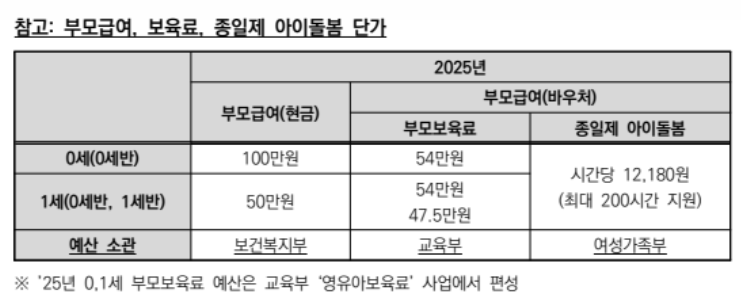 - 12개월 이상 아이: 보육료 475,000원 제외한 25,000원을 현금으로 지급