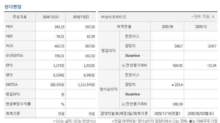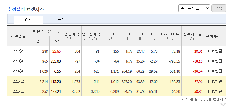 - 매출 2배 퀀텀 점프: 2025년 매출액은 전년 대비 115% 폭증한 2,214억 원이 예상됩니다.