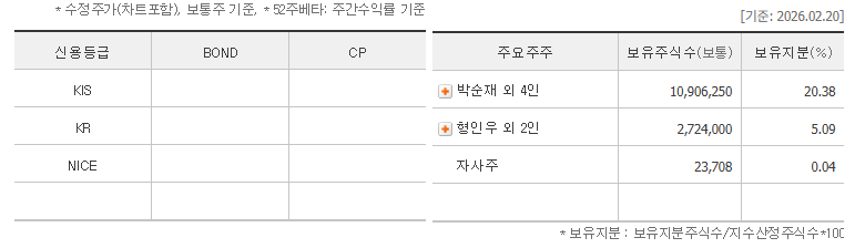 - 최대주주: 박순재 외 4인 (20.38%) - 창업주의 강력한 오너십