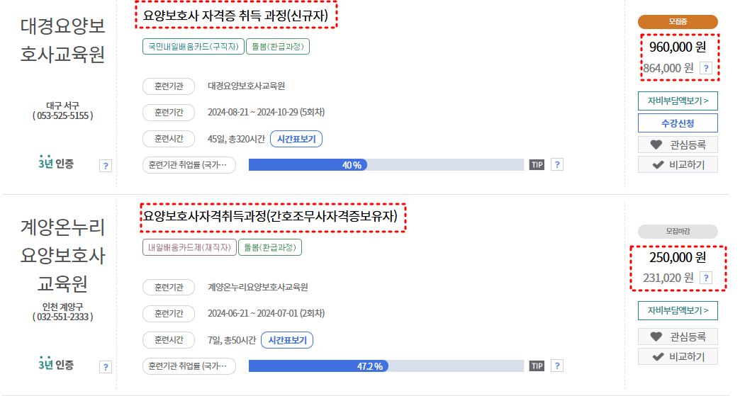 직업훈련포털에 접속하여, 검색키워드에 '요양보호사'를 입력하고, 지역을 거주하는 지역을 선택하여 검색해 보세요.