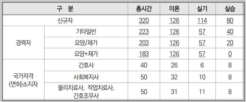 앞서 말했듯이 표준교육과정은 총 320시간으로 이론과 실기, 240시간과 현장실습 80시간을 충족해야합니다. 단, 교육과정은 신규자와, 국가자격(면허) 소지자, 경력자 여부에 따라서 교육이수시간이 다릅니다.