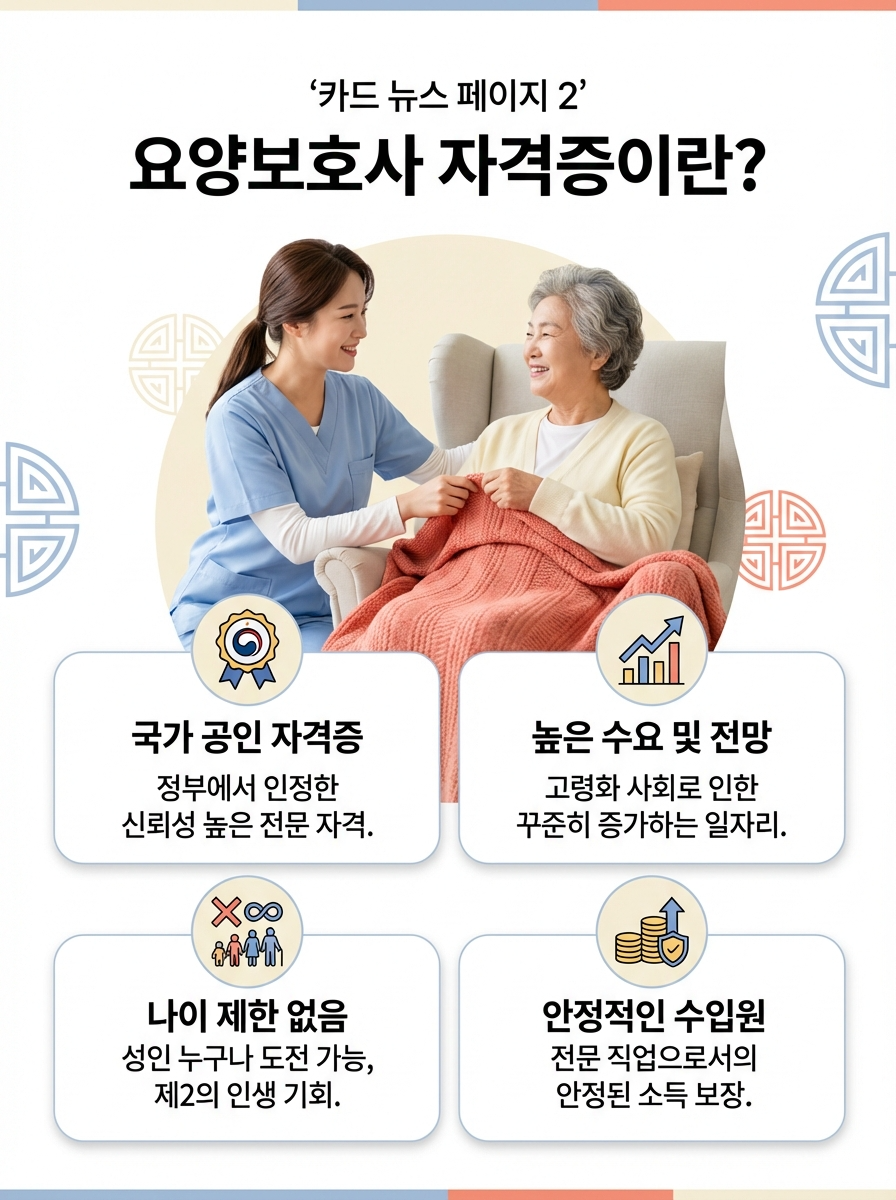 요양보호사 자격증은 노인장기요양법에 따라 노인 또는 장애인의 신체활동 및 일상생활을 지원하는 전문 인력에게 부여되는 국가자격증입니다. 고령화 사회가 심화되면서 요양보호사의 수요는 매년 증가하고 있으며, 정년 없이 오래 일할 수 있다는 장점 덕분에 중장년층에게 특히 인기가 높습니다.