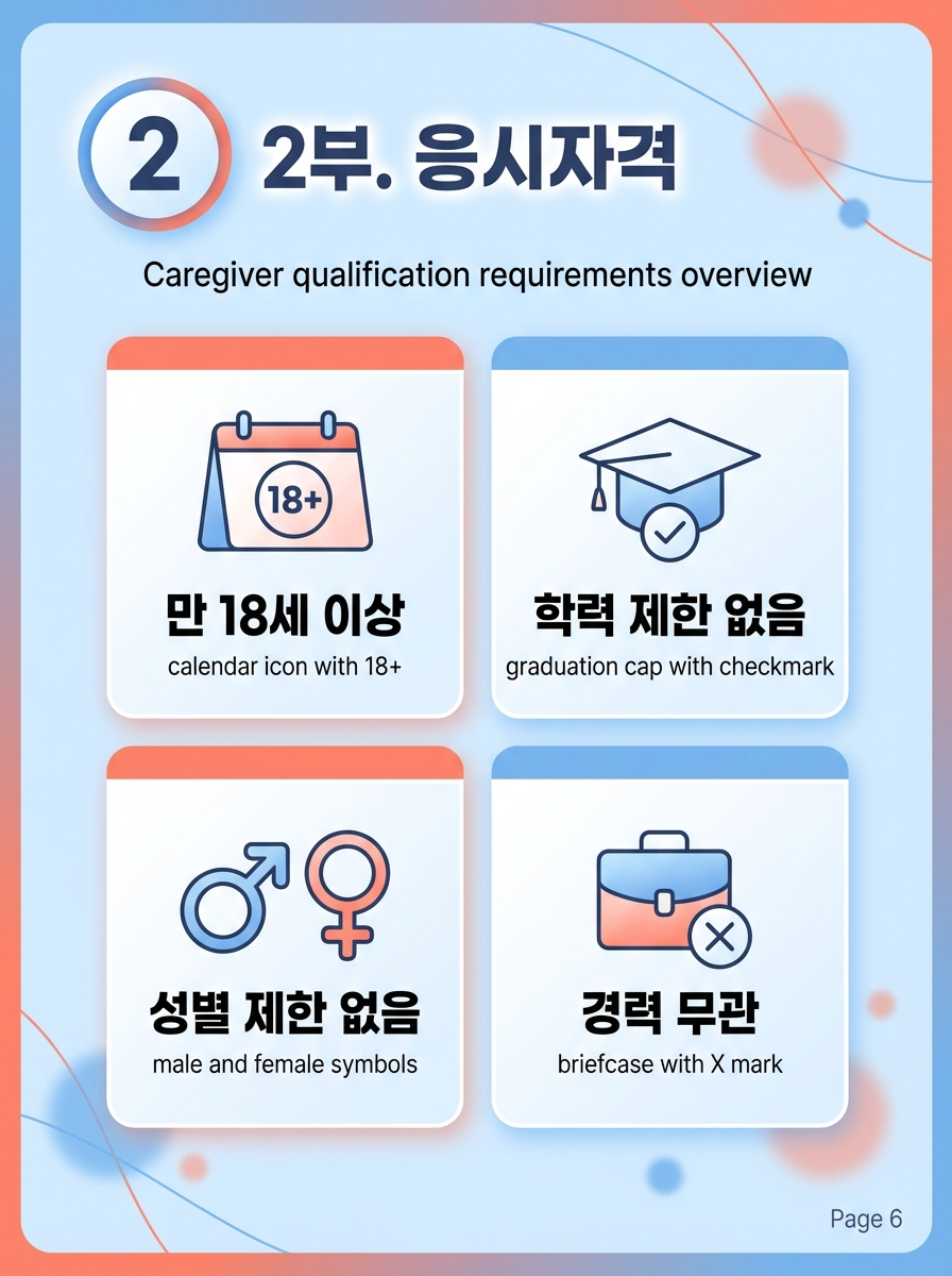 요양보호사 자격증 취득방법의 첫 단계는 응시자격을 확인하는 것입니다. 2026년 현재, 요양보호사 응시자격은 매우 간단합니다. 만 18세 이상이면 나이, 성별, 학력, 경력에 제한 없이 누구나 응시할 수 있습니다.