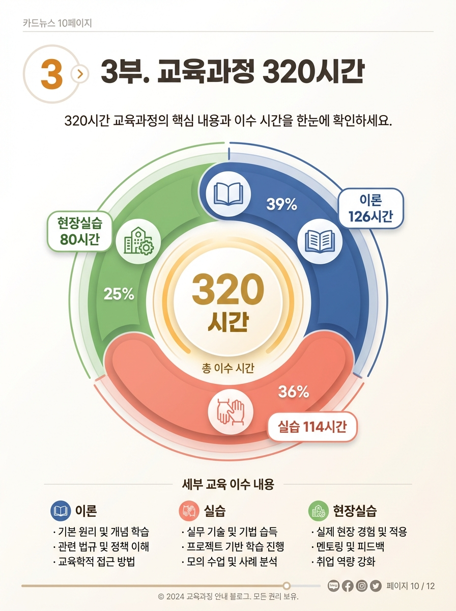 요양보호사 자격증 취득방법의 핵심은 바로 교육과정 이수입니다. 2024년 1월 1일 개정된 노인복지법 시행규칙에 따라 표준교육과정이 320시간으로 확대되었으며, 이론·실기·실습으로 구성되어 있습니다.