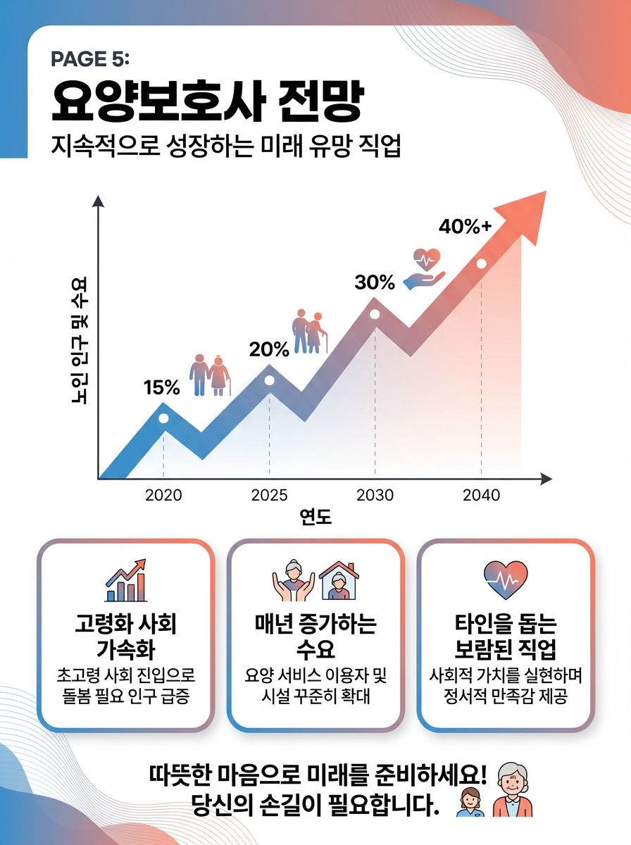 지금까지 요양보호사 자격증 취득방법을 응시자격부터 교육과정, CBT 시험, 국비지원까지 완벽하게 정리해드렸습니다. 2026년 현재, 고령화 사회가 가속화되면서 요양보호사의 수요는 계속 증가하고 있으며, 정년 없이 오래 일할 수 있다는 점에서 많은 분들이 선택하고 있는 직종입니다.