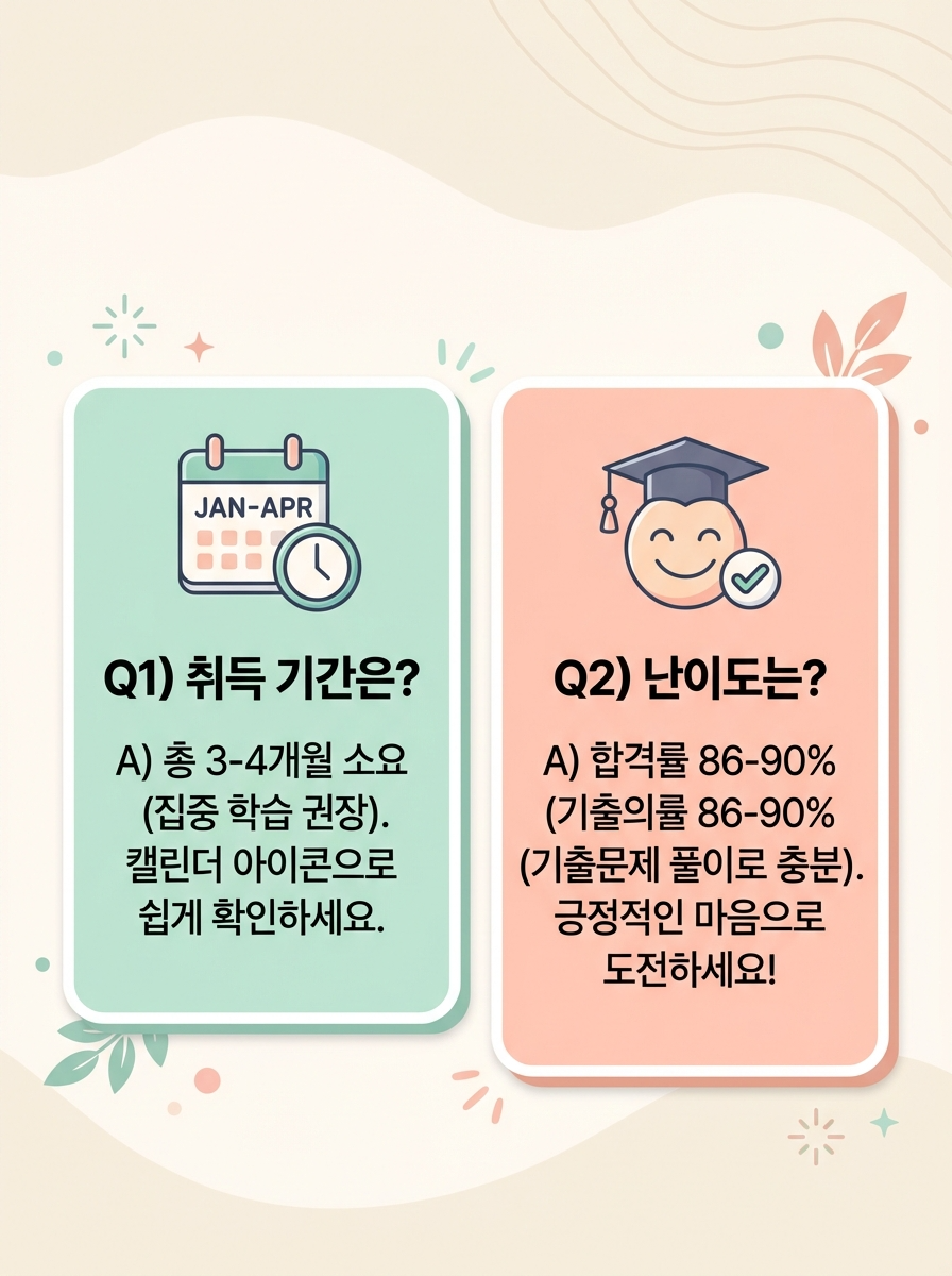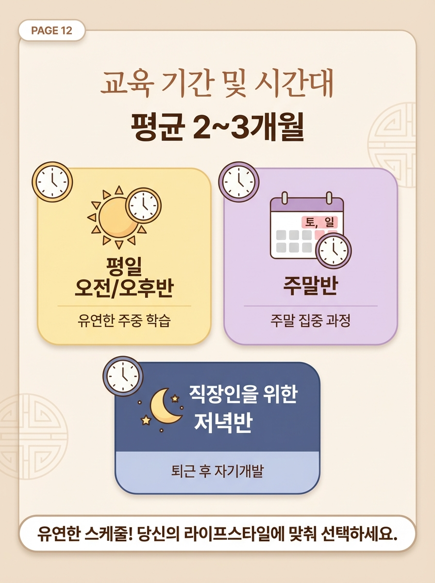 A. 교육과정 이수에 약 2~3개월, 시험 준비 및 응시에 약 1개월로 총 3~4개월 정도 소요됩니다. 국가자격증 소지자는 40~50시간 교육으로 단축 가능합니다.